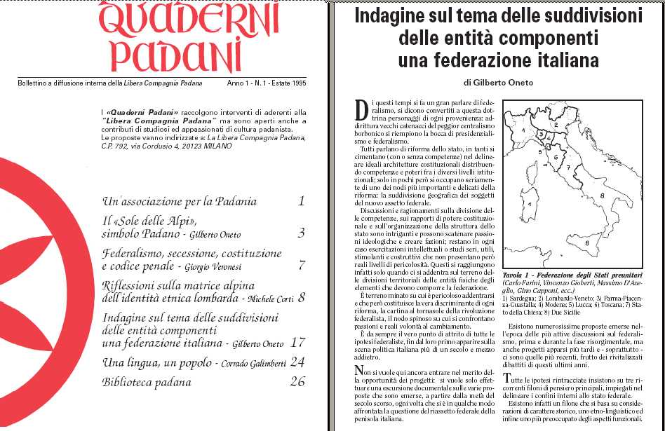 Pubblichiamo un interessante lavoro di Gilberto Oneto: "Indagine sul tema delle suddivisioni delle entità componenti una federazione italiana" tratto da "Quaderni Padani - Anno I, N. 1 - Estate 1995 - pag. 17-23".