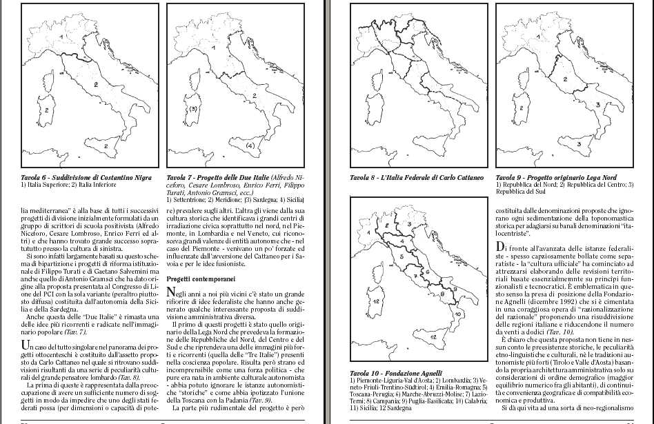 1) Valle d'Aosta; 2) Valle Padana; 3) Italia Centrale; 4) Trentino Südtirol; 5) Friuli Venezia Giulia; 6) Italia Meridionale; 7) Sicilia; 8) SardegnaÈ sintomatico che la stampa ed i mezzi di informazione "di regime", che si sono accaniti contro questo progetto, non abbiano fatto nessuna di queste considerazioni ma che si siano prodigati nel sottolineare dettagli del tutto irrilevanti come la mancanza di continuità geografica fra la Campania e la Calabria.