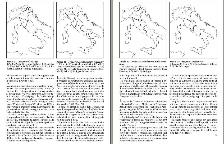 Sugli stessi princìpi si fonda anche la proposta "padanista" illustrata sul numero 4 di Ethnica (Autunno 1994) ed in seguito ulteriormente delineata (Tav. 14). Essa parte dalla costante rappresentata dall'idea di tripartizione di cui però comincia ad elaborare con più precisione le modalità di costituzione dei confini. Restano i riconoscimenti delle forti identità delle isole e viene proposta la creazione di un territorio federale attorno a Roma.