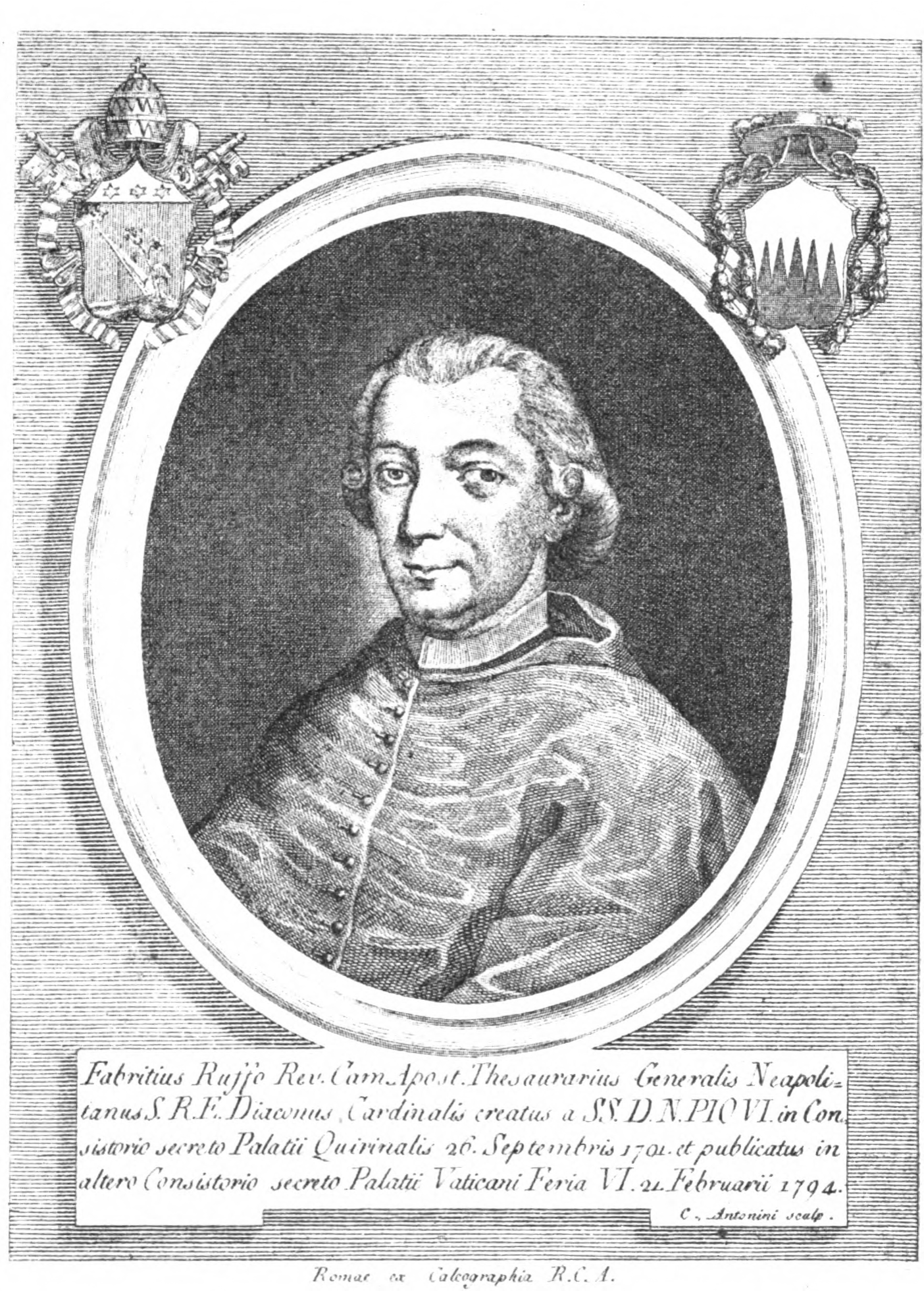 Ora mi resta qualche cosa da dire circa il ritratto che ho messo in fronte al mio lavoro. Dopo molte ricerche mie e del sig. Guglielmo Ingenmev per commissionedell'editore, è riuscito di rintracciare due ritratti del mio Cardinal generale. L’uno, inciso dal Böttger di Dresda, rappresenta Fabrizio Ruffo nelle vesti di principe della Chiesa; l’altro, concepito e condotto un po’ rozzamente da mano ignota, nella divisa di generale dell'anno 1799, con un abito che può esser preso pel manto d’un cardinale. Per l'immagine che dovea servire a figurare innanzi al mio libro fu preferita una combinazione fra i due ritratti; e al primo furon tolte, sebbene corrispondenti a un’età alquanto più giovane, le fini e intelligenti fattezze, al secondo il vestiario (1).